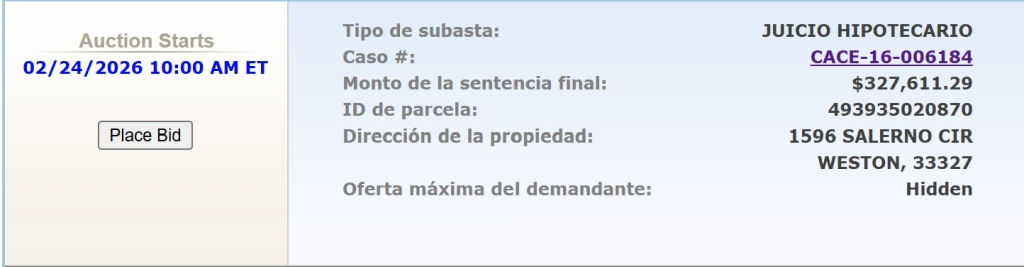 1596 Salerno Cir es una casa de 127 metros cuadrados en un terreno de 418 metros cuadrados con 3 dormitorios y 2 baños. Monto de la sentencia final: $327,611